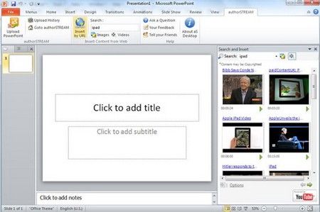 Thay vì phải mở trình duyệt web để tìm và tải hình ảnh về máy, hoặc sao chép mã nhúng của video clip YouTube rồi mới chèn vào slide theo cách thủ công, aSDesktop cho phép bạn tìm kiếm và chèn hình ảnh, video clip YouTube trực tiếp từ giao diện PowerPoint 2007/2010.