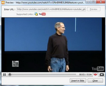 Nếu bạn hài lòng với video clip đã chọn, bấm nút Insert in Slide để chèn clip vào slide. Ngược lại, bấm Close để đóng cửa sổ Preview và tiếp tục tìm kiếm clip khác. Nút Upload PowerPoint bên trái cho phép bạn tải file PowerPoint đang soạn (đã được lưu trước đó) lên dịch vụ authorSTREAM để lưu trữ trực tuyến, điều này đòi hỏi bạn phải đăng ký một tài khoản tại AuthorStream.com.