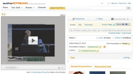 Sau khi upload hoàn tất, địa chỉ mở file PowerPoint sẽ được hiển thị trong khung URL. Bạn có thể nhấp vào liên kết View on aS! và bấm tiếp nút phát để trình chiếu file PowerPoint trên dịch vụ authorSTREAM trong cửa sổ trình duyệt mặc định. File này sẽ được lưu trong mục Your Stuff > Your Presenations.