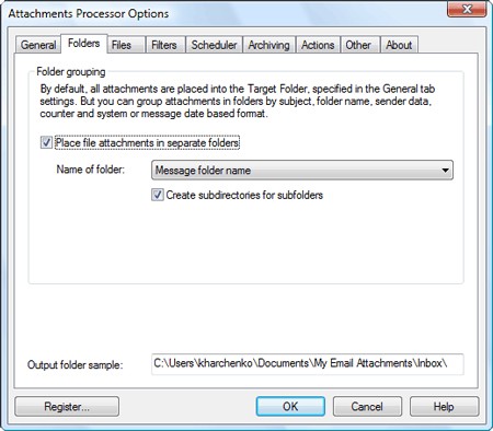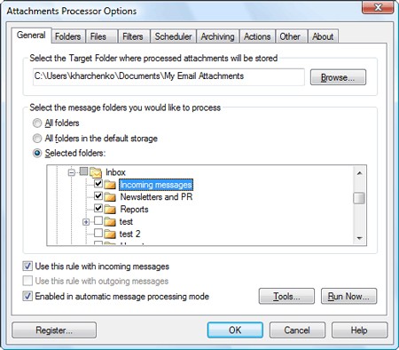 Sau khi cài đặt, APO sẽ tích hợp chức năng Attachments Processor vào menu Tools của MS Outlook. Đây là lệnh để mở cửa sổ chương trình. Cửa sổ Attachments Processor Options bao gồm 8 thẻ: General, Folders, Files, Filters, Scheduler, Archiving, Other và About. Dưới đây là một số điểm cần lưu ý trong từng thẻ: