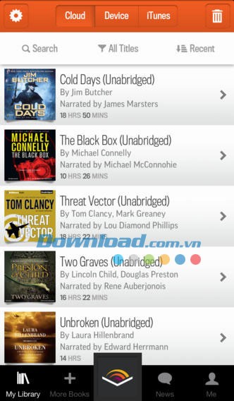 Toàn bộ sách Audible đều có thể tải xuống không dây từ My Library, trên thẻ Cloud và từ ứng dụng Audiobooks from Audible for iOS.