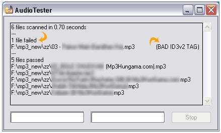 - Audio Tester sẽ tự động quét và hiển thị kết quả kiểm tra, thông báo các lỗi được phát hiện trong từng file. Ví dụ, chương trình có thể báo lỗi thiếu tag ID3 (BAD ID3v2 TAG) như trong hình minh họa.