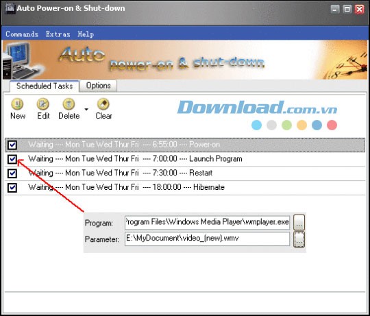 Hộp thoại Edit scheduled task xuất hiện, bạn bắt đầu thiết lập các thuộc tính của nhiệm vụ: tên nhiệm vụ, ngày nhiệm vụ được thực hiện, thời điểm bắt đầu, và nhiệm vụ cụ thể. Các nhiệm vụ cụ thể bao gồm các tính năng của chương trình: tắt máy, khởi động lại, khóa máy, Hibernate, Standby, mở tệp theo đường dẫn, phát tệp âm thanh (*.wav, *.mp3, *.rm, *.ram, *.ra, *.swf, *.wma, *.midi), chạy ứng dụng, đóng ứng dụng, truy cập địa chỉ web, hiển thị thông báo. Bạn có thể chọn thực hiện nhiều tính năng cùng một lúc.
