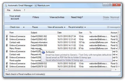 Automatic Email Manager là giải pháp giúp bạn tự động hóa việc quản lý và theo dõi hộp thư điện tử. Phần mềm này sẽ tự động phát hiện các email mới và thực hiện các tác vụ được cài đặt sẵn, chẳng hạn như in email hoặc các tệp đính kèm (như FAX, PDF, Word, Excel, hình ảnh, TIFF,...), xóa email khỏi máy chủ, sao lưu email và tệp đính kèm xuống ổ cứng, hoặc gửi các phản hồi tự động.