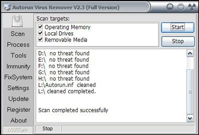 Thao tác thực hiện rất đơn giản: chỉ cần nhấn nút Scan và chờ đợi quá trình quét hoàn tất. Kết quả là virus autorun/autorun.inf sẽ không còn khả năng xuất hiện trở lại.