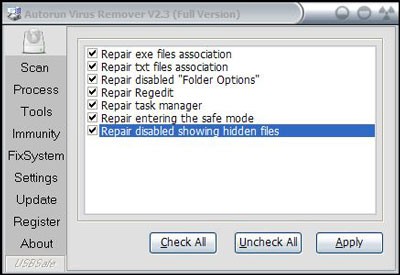 Cung cấp các công cụ để khắc phục các vấn đề do virus Autorun gây ra, chẳng hạn như vô hiệu hóa Task Manager hoặc làm mất Folder Options… (chọn tất cả các mục > nhấp Apply và khởi động lại máy tính).