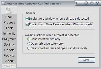 Cho phép tùy chỉnh các thiết lập của chương trình. Nên chọn tùy chọn để chương trình tự động chạy cùng Windows và tự động quét, tiêu diệt virus Autorun trên USB khi kết nối (Clean infected file only).