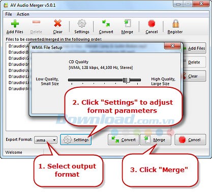 AV Audio Merger không chỉ đơn thuần là công cụ gộp file, mà còn có chức năng chuyển đổi các định dạng âm thanh đầu vào sang các định dạng phổ biến như MP3, WMA, WAV hoặc OGG.