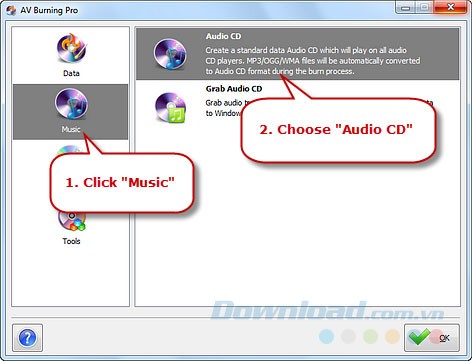 Đưa đĩa CD có khả năng ghi vào ổ đĩa và mở chương trình AV Burning Pro. Chọn biểu tượng "" để bắt đầu quá trình hướng dẫn ghi đĩa CD.
