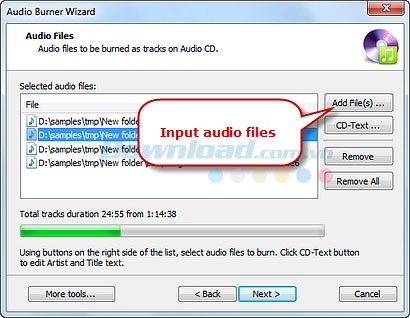 Nhấn vào nút "..." để thêm các tập tin âm thanh bạn muốn ghi vào danh sách. Bạn có thể chỉnh sửa thông tin tiêu đề và nghệ sĩ cho từng bài hát.