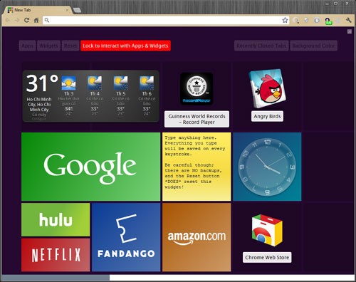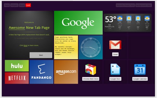 Phong cách Metro của Windows 8 là một trong những lựa chọn giao diện được yêu thích nhất hiện nay. Để trải nghiệm giao diện này trên trang New Tab, bạn có thể cài đặt tiện ích mở rộng Awesome New Tab Page (NTP). Điểm đặc biệt của tiện ích này là khả năng cung cấp nhiều widget hữu ích.