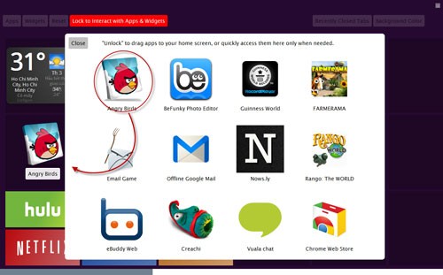 Để sử dụng các ứng dụng như một tiện ích trên màn hình chính, hãy nhấp vào nút Unlock, sau đó kéo và thả ứng dụng mong muốn vào vùng trống trên trang New Tab. Lặp lại quy trình này với các ứng dụng khác.