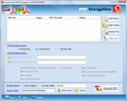 Công cụ này còn có khả năng vô hiệu hóa chức năng điền form PDF, loại bỏ khả năng chèn bình luận, và ngăn chặn việc chỉnh sửa nội dung PDF. Bạn có thể sử dụng công cụ mã hóa PDF này để bảo vệ đồng thời nhiều file PDF bằng các thuật toán mã hóa mạnh mẽ RC4 và AES với độ bảo mật 128 bit.