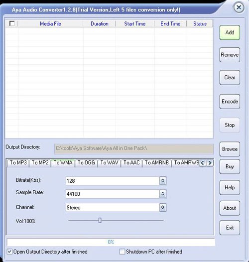 Aya Audio Converter là một ứng dụng chuyển đổi audio cực kỳ hữu ích, giúp bạn dễ dàng trích xuất âm thanh từ các tập tin video. Đồng thời, phần mềm này hỗ trợ chuyển đổi các file audio giữa nhiều định dạng khác nhau như WAV, OGG Vorbis, MP3, MP2, WMA, AAC, M4A, AMR và các định dạng media thông dụng khác, đáp ứng mọi nhu cầu sử dụng của bạn.
