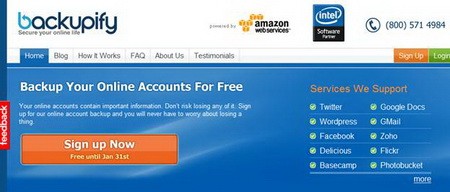 Dịch vụ Backupify cung cấp khả năng sao lưu dữ liệu trực tuyến tự động từ 13 nền tảng khác nhau. Đặc biệt, trong thời gian từ nay đến ngày 31 tháng 1 năm 2010, Backupify đang triển khai chương trình ưu đãi, cho phép người dùng đăng ký tài khoản miễn phí để được sao lưu dữ liệu vĩnh viễn với dung lượng không giới hạn.