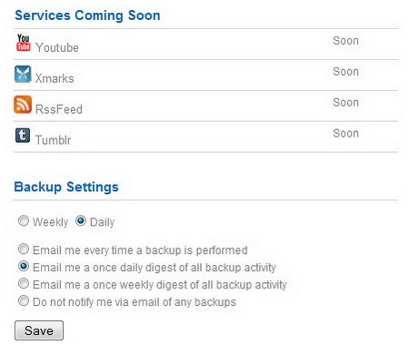 Backupify dự kiến sẽ hỗ trợ thêm bốn dịch vụ khác trong tương lai: Youtube, Xmarks, RssFeed và Tumblr.