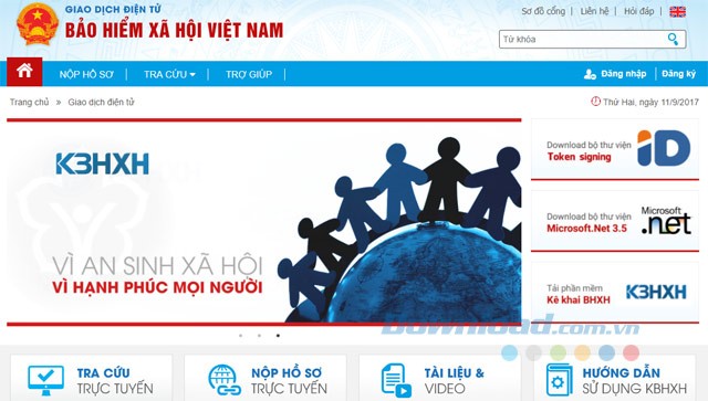 Menu điều hướng được bố trí hợp lý với các mục như: Tra cứu thông tin, Đăng ký tham gia BHXH, Thủ tục hành chính và Các dịch vụ trực tuyến khác.