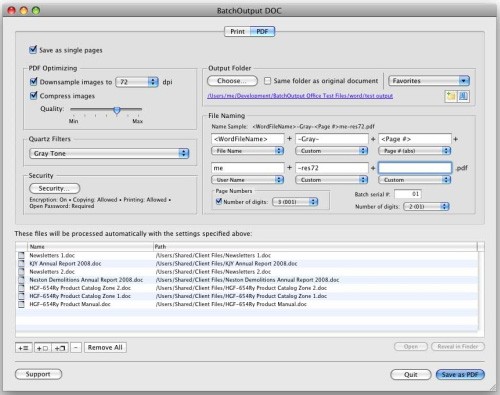 BatchOutput DOC là giải pháp tự động hóa việc in ấn và tạo file PDF từ các tài liệu Microsoft Word. Chỉ cần đưa các file Word vào danh sách của phần mềm, điều chỉnh các thiết lập cần thiết, BatchOutput DOC sẽ đảm nhiệm toàn bộ các tác vụ còn lại.