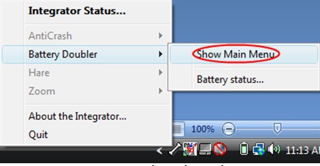Bây giờ, chúng ta sẽ tiến hành cấu hình các thông số phù hợp để tối ưu hóa laptop của bạn. Sau khi cài đặt Battery Doubler, biểu tượng hình xương sẽ xuất hiện ở góc dưới bên phải màn hình. Nhấp chuột phải vào biểu tượng này, chọn "Battery Doubler" và sau đó chọn "Show main menu".