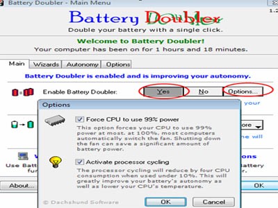 (Việc giới hạn tốc độ CPU ở mức 99% là cần thiết vì khi CPU hoạt động hết công suất 100%, tốc độ quạt tản nhiệt sẽ tăng lên đáng kể, dẫn đến tiêu thụ nhiều pin hơn. Do đó, Battery Doubler sẽ kiểm soát tốc độ CPU để tiết kiệm năng lượng.)