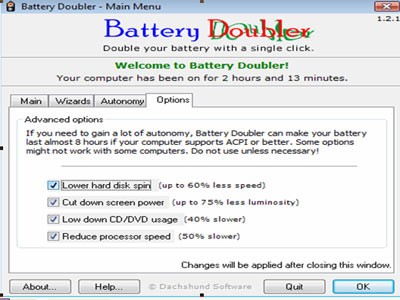 Một chiếc laptop có cấu hình mạnh mẽ nhưng thời lượng pin kém sẽ không khác gì một máy tính để bàn thông thường. Battery Doubler sẽ giúp laptop của bạn phát huy tối đa hiệu năng, kéo dài thời gian sử dụng pin lên gấp đôi.