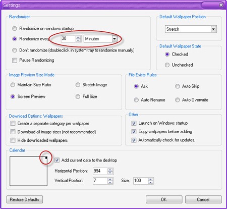 (bật thay đổi ảnh khi khởi động máy), (tự động thay đổi ảnh sau một khoảng thời gian tùy chỉnh: giây/phút/giờ/ngày), (chỉ thay đổi khi nhấp đúp vào biểu tượng trên khay hệ thống), (tạm dừng thay đổi): (giữ nguyên kích thước), (kéo dãn), (hiển thị như thực tế), (kích thước lớn nhất). : (tạo thư mục riêng cho mỗi ảnh), (tải tất cả các kích thước của ảnh), (ẩn các ảnh đã tải xuống trong danh sách). : hiển thị ngày/tháng trên desktop, bạn có thể chọn vị trí và kích thước của ô lịch. Lưu ý các dấu chấm đen nhỏ trên hình minh họa để biết vị trí chính xác. : (khởi động cùng Windows), (copy ảnh vào máy tính trước khi thêm), (tự động cập nhật). - Chỉ những ảnh đã được đánh dấu chọn mới được sử dụng trong quá trình thay đổi hình nền. - Bạn có thể kéo và thả ảnh từ trang web trực tiếp vào danh sách. - Khi sử dụng phím PrintScreen hoặc các chương trình chụp ảnh màn hình, bạn có thể sử dụng ảnh đó ngay trong Bee Wallpapers bằng cách chọn File > Paste From the clipboard.