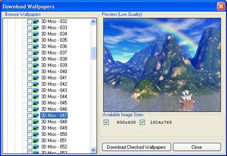 Đầu tiên, hãy chọn danh sách bạn muốn sử dụng, sau đó nhấp vào biểu tượng "Download wallpapers". Phần mềm sẽ tải danh sách các thư mục hình ảnh để bạn lựa chọn, ví dụ như Nature (Thiên nhiên), Ocean (Đại dương), Science Fiction (Khoa học viễn tưởng)… Nhấp vào mũi tên ở đầu mỗi thư mục để mở rộng và xem các thư mục con bên trong. Nhấp vào tên hình ảnh để xem trước. Nếu bạn ưng ý, hãy đánh dấu chọn vào ô trống trước hình ảnh, sau đó chọn Avaliable Image Sizes (mặc định là 1024 x 768) để chọn kích thước phù hợp. Nhấp Download checked wallpapers để tải về và thêm vào danh sách. Nhấp Close để đóng cửa sổ.