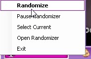 Khay hệ thống cung cấp các tùy chọn như thay đổi ảnh ngẫu nhiên (Randomize), tạm dừng thay đổi ngẫu nhiên (Pause Randomize), chọn ảnh hiện tại để quản lý (Select Current) và mở cửa sổ chính (Open Randomize).