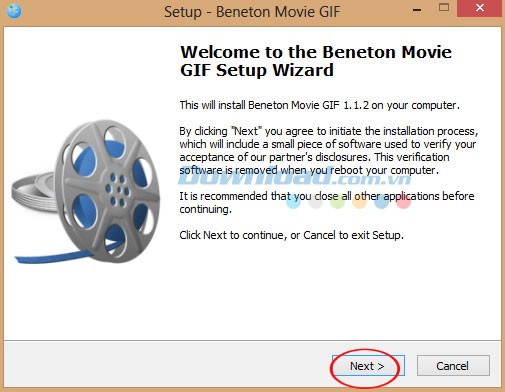 Sau đó, một trình hướng dẫn cài đặt Beneton Movie GIF sẽ được hiển thị để hỗ trợ bạn. Nhấn Next để bắt đầu quá trình cài đặt. Lưu ý, nên đóng các ứng dụng đang chạy khác trước khi tiếp tục.