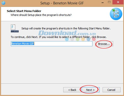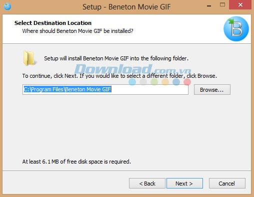 Tiếp đến, chọn thư mục mà bạn muốn lưu các file cài đặt của chương trình. Mặc định, chương trình sẽ được cài đặt vào: C:\Program Files\Beneton Movie GIF. Nếu bạn muốn chọn một thư mục khác, hãy bấm Browse, sau đó bấm Next để chuyển sang cửa sổ tiếp theo.