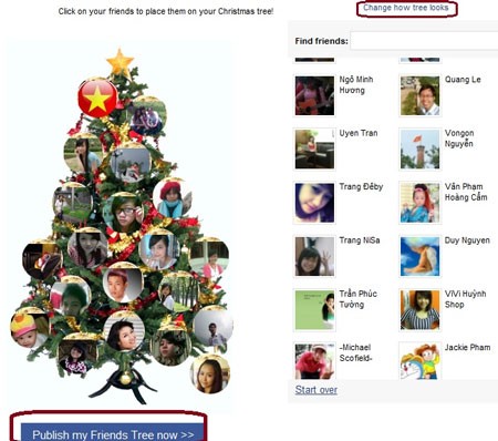Để thay đổi diện mạo của cây thông Noel, hãy nhấp vào liên kết Change how tree looks. Sau khi chọn xong, nhấn vào nút Publish my Friends Tree now, sau đó nhấn tiếp Publish và cuối cùng là Send.