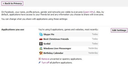 Tiếp theo, nhấp vào liên kết dẫn đến bảng thiết lập. Sau đó, nhấn vào nút Edit Settings tại mục Application Privacy. Tại đây, bạn sẽ thấy danh sách các ứng dụng bạn đã thêm vào. Để gỡ bỏ, hãy nhấp vào biểu tượng gỡ bỏ nằm bên cạnh nút Edit Settings, sau đó nhấn Remove để xóa ứng dụng khỏi Facebook.
