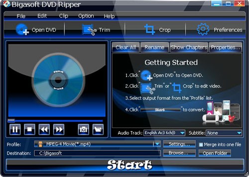 Bigasoft DVD Ripper là một ứng dụng rip DVD được thiết kế để dễ dàng sử dụng, cho phép chuyển đổi đĩa DVD sang nhiều định dạng video và audio thông dụng. Các định dạng được hỗ trợ bao gồm AVI, DivX, Xvid, MP4, H.264, WMV, MOV, FLV, MKV, MPEG-1, MPEG-2, 3GP, 3GPP, VOB, RM, WMA, MP3,... với tốc độ nhanh và chất lượng hình ảnh, âm thanh được đảm bảo.