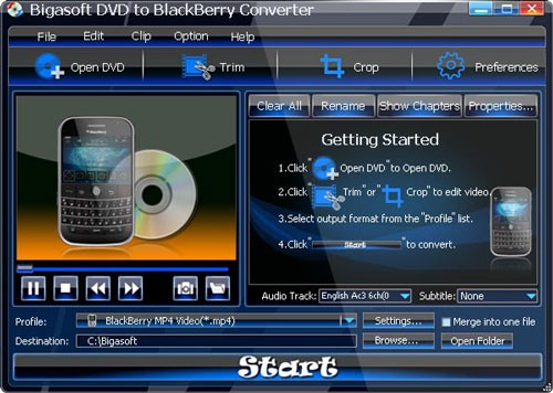 Bigasoft DVD to BlackBerry Converter là một ứng dụng chuyển đổi video chuyên nghiệp, cung cấp khả năng chuyển đổi đĩa DVD sang nhiều định dạng tương thích với các thiết bị BlackBerry khác nhau, bao gồm BlackBerry Tour, BlackBerry Storm, BlackBerry Bold, BlackBerry Curve, BlackBerry Pearl,... Quá trình chuyển đổi được thực hiện nhanh chóng với chất lượng hình ảnh và âm thanh cao.