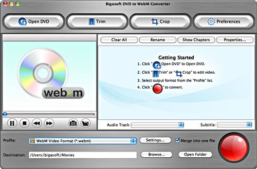 Bigasoft DVD to WebM Converter for Mac là ứng dụng tiên phong trong việc rip và chuyển đổi đĩa DVD sang định dạng WebM, cho phép người dùng tạo ra các file WebM từ đĩa phim DVD trên hệ điều hành Mac OS X. WebM, với cấu trúc video VP8 và audio Ogg Vorbis, đang ngày càng trở nên phổ biến.