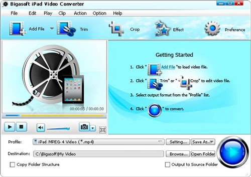 Bigasoft iPad Video Converter là giải pháp tối ưu để chuyển đổi hầu hết các định dạng video, bao gồm WMV, ASF, AVI, DivX, MKV, MOD, TOD, MTS, VOB, MPEG, MOV, RM, 3GP, cũng như các file 1080p hoặc 1080i MKV, M2TS sang định dạng MP4 tương thích với iPad và H.264 720p.