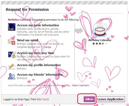 Birthday Calendar là phiên bản cập nhật của ứng dụng trên Facebook. Nếu bạn muốn trải nghiệm các tính năng cũ, chỉ tập trung vào việc hiển thị ngày sinh trên lịch, bạn có thể truy cập http://apps.facebook.com/fdcalendar/?ref=caption và nhấn Allow.