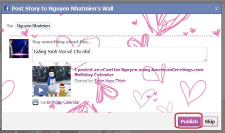 Sau khi chấp nhận sử dụng tiện ích, một bảng thông báo nhỏ sẽ xuất hiện, hỏi bạn có muốn chia sẻ với bạn bè hay không. Nếu đồng ý, hãy điền thông tin cần thiết và nhấn Publish.