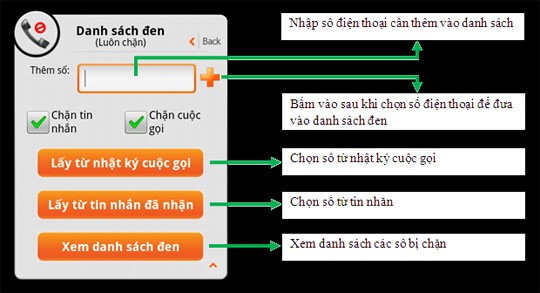 Danh sách đen: Ứng dụng sẽ tự động chặn và ghi lại vào nhật ký spam tất cả tin nhắn hoặc cuộc gọi đến từ các số điện thoại được liệt kê trong danh sách này.