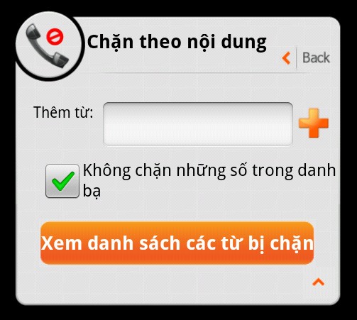 Chặn theo nội dung tin nhắn: Ứng dụng sẽ chặn và đưa vào nhật ký spam tất cả tin nhắn chứa một trong các từ khóa mà người dùng đã thêm vào danh sách. Thao tác thêm từ khóa tương tự như thêm số vào danh sách đen.