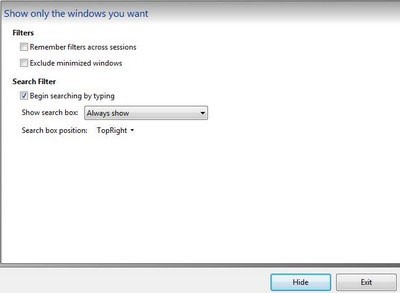 Để sử dụng tính năng tìm kiếm, nhấp chuột phải vào biểu tượng phần mềm trên khay hệ thống và chọn Settings. Trong giao diện chính, chọn mục Filter từ menu bên trái. Đánh dấu vào tùy chọn Begin searching by typing. Tại mục Show search Box, hãy chọn Always show, sau đó nhấn Hide để đưa phần mềm trở lại khay hệ thống.