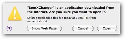 Sau khi tải xuống, kích hoạt file BootXChanger để bắt đầu sử dụng. Một hộp thoại của MacOS sẽ xuất hiện, nhắc nhở người dùng cẩn thận vì đây là phần mềm tải từ Internet. Nhấn Open để tiếp tục.