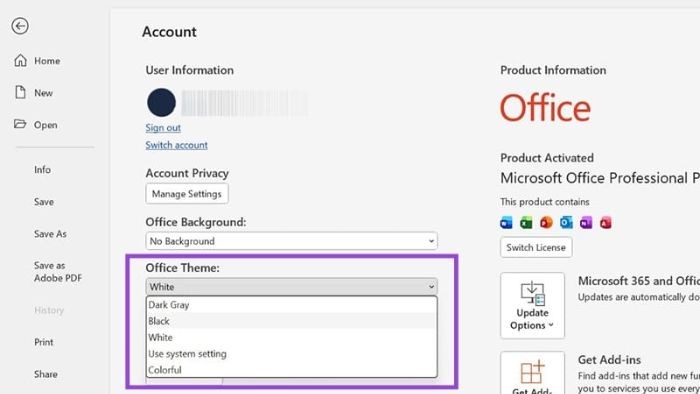 Bước 3: Trong cửa sổ hiện ra, tìm mục Office Theme, nhấp vào menu thả xuống và chọn Black để kích hoạt chế độ tối.
