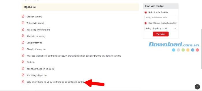 Bước 2: Sau khi đăng nhập thành công, chọn mục Thủ tục hành chính, sau đó lựa chọn dịch vụ Điều chỉnh thông tin về cư trú trong cơ sở dữ liệu về cư trú.