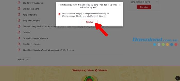 Bước 3: Chọn tiếp Đề nghị cơ quan đăng ký thường trú điều chỉnh thông tin và nhấn Tiếp tục để chuyển sang bước tiếp theo.