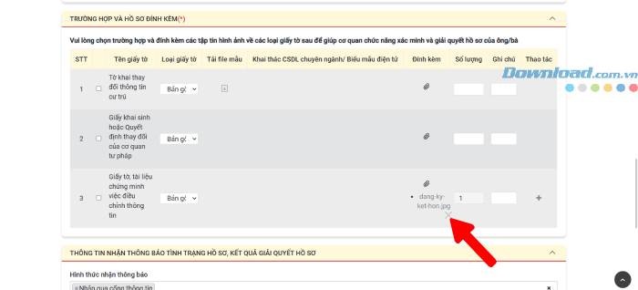 Bước 6: Tại mục hồ sơ đính kèm, phần 3 - Giấy tờ, tài liệu, tải ảnh chụp Giấy chứng nhận kết hôn của bạn lên hệ thống.