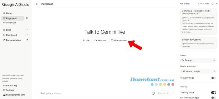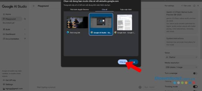 Tính năng chia sẻ màn hình (Screen Share) cho phép người dùng truyền trực tiếp hình ảnh màn hình của mình trong môi trường làm việc của Google AI Studio.