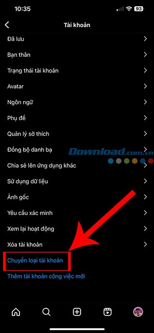Bước 3: Cuộn xuống phía dưới của các cài đặt Tài khoản, sau đó chọn mục Chuyển đổi loại tài khoản.