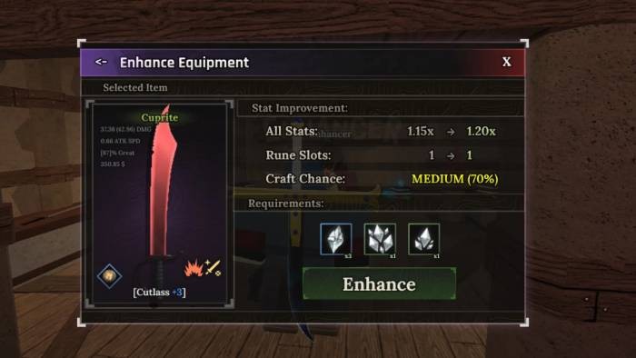 Khi đã chuẩn bị đủ Essence, hãy nhấn nút Enhance màu xanh lục để nâng cao chỉ số của trang bị. Khả năng thành công của quá trình này được hiển thị rõ ràng ở mục Craft Chance.