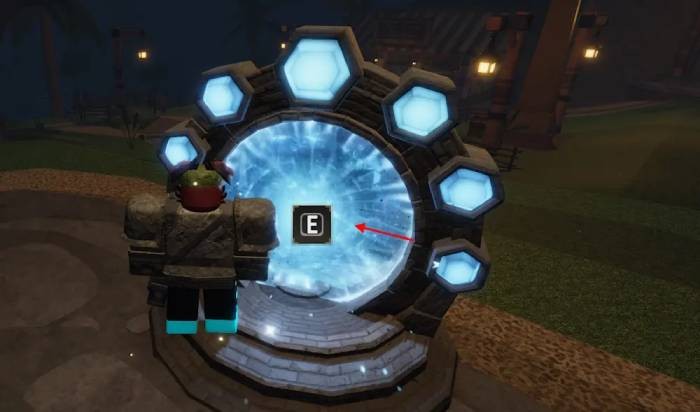 Sau khi đã đặt thành công, di chuyển đến gần cổng dịch chuyển và nhấn phím E để mở giao diện lựa chọn điểm đến. Chọn hòn đảo mà bạn muốn dịch chuyển tới, sau đó nhấn nút Teleport để hoàn tất quá trình.